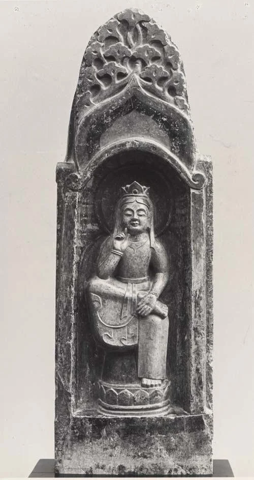 This Chinese portrayal of the Bodhisattva Maitreya depicts him sitting in a posture with one leg draped over the other. This is known as the "pensive" posture, and he is depicted as such because he can quickly stand and descend to earth at a moment's notice.