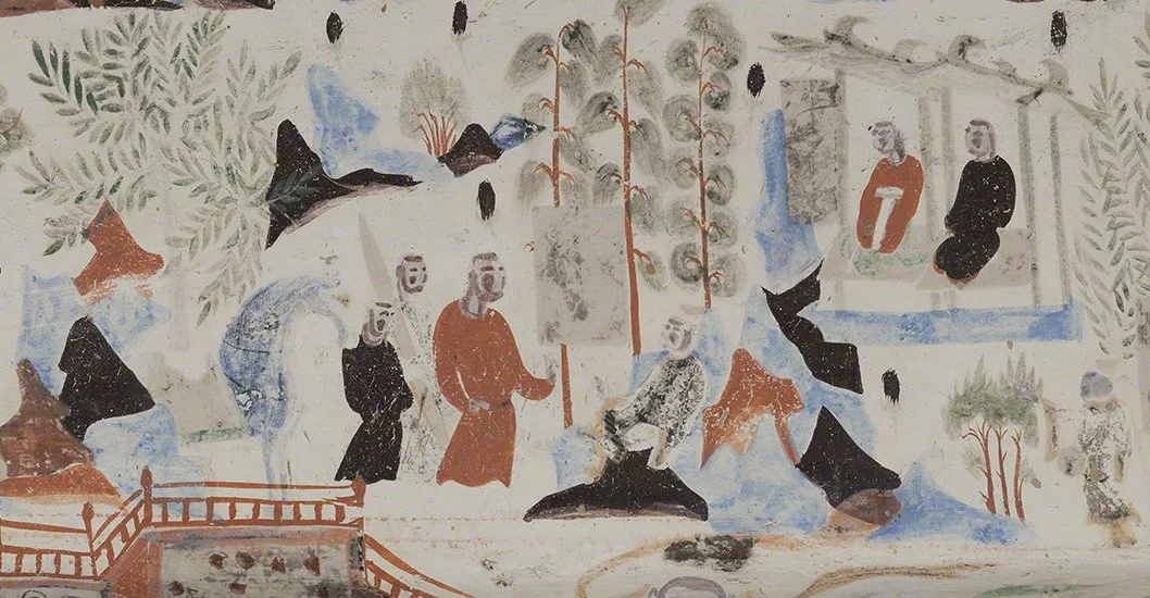 Detail of the king of Benares visiting Syama's parents from the Syama Jataka Tale mural. Mogao Cave 302. Sui, 581-618 CE. Dunhuang. Image courtesy of the Dunhuang Academy.